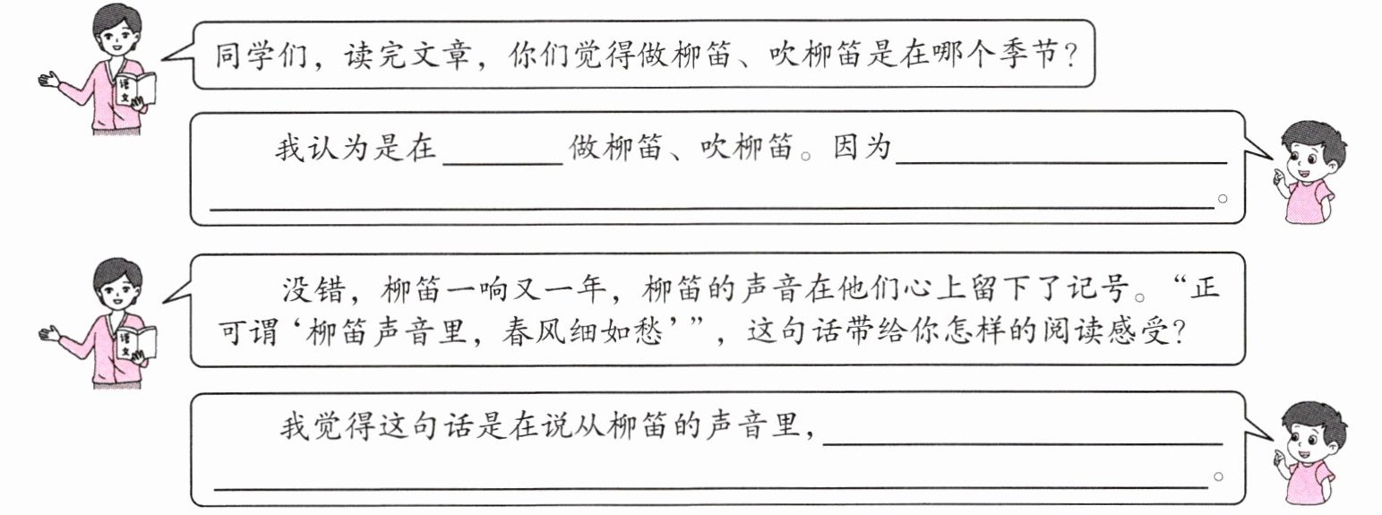 没错,柳笛一响又一年,柳笛的声音在他们心上留下了记号。“正可谓‘柳笛声音里,春风细如愁’”,这句话带给你怎样的阅读感受?