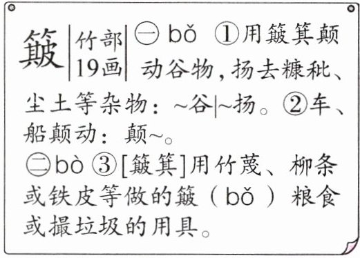 2. 加点字"簸"在字典中的解释如右图,据义定音是读准字音的好方法。"浪淘风簸自天涯"中的"簸"的读音是______,意思是______(填序号)。