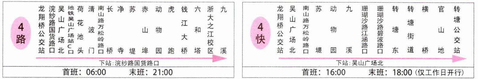 3.龙翔桥公交站 4路 4快 示例:由于4快公交线只在工作日开行,所以在周末只能坐4路公交车,在龙翔桥公交站上车,到苏堤站下车。