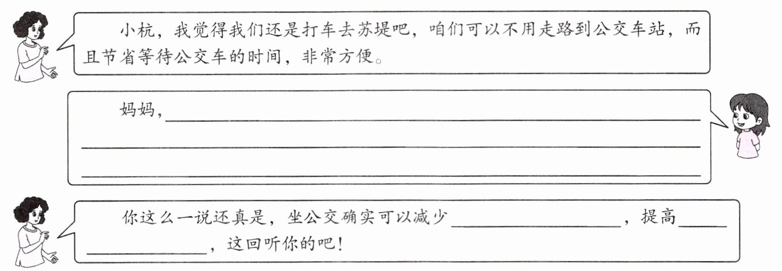 4. [口语交际]关于出行方式,妈妈和小杭的意见产生了分歧,请和小杭一起跟妈妈协商。