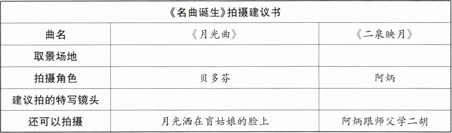 5. [拓展迁移]某电视台想拍摄一档名为《名曲诞生》的栏目。根据选文,写一写拍摄建议书。