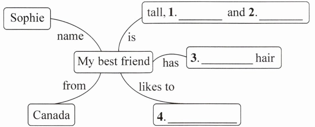 My best friend is Sophie. Sophie is a new student in my class. She is from Canada. She's tall and thin. She has short hair. She's quiet. She likes to read books in the school library(图书馆). We first meet in the library. We both(都) like animal books. We often share books. Then we become good friends. Sophie always helps me with English. And I help her with Chinese. We also play games together.