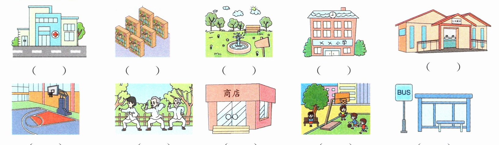任务一:依次在公园、图书馆、操场、商店、医院和体育馆下方的括号内画“√”。