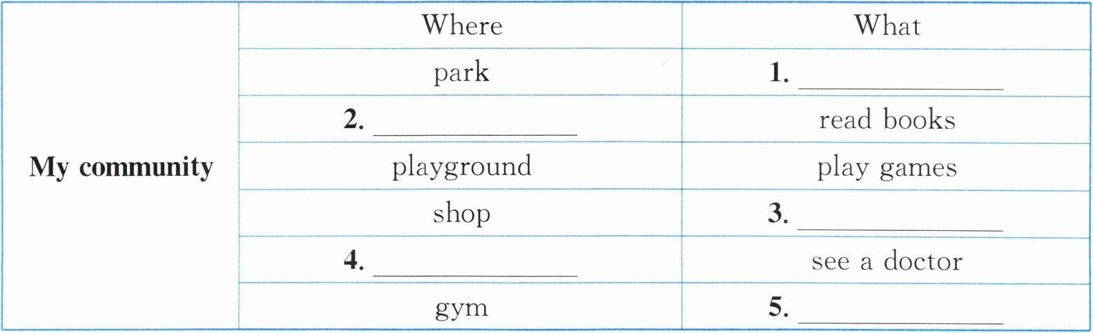 This is my community. It's big and nice. I live there with my family. There is a nice park. I often take a walk there. There is a library. I often read books there. This is the playground. Many children play games there. There is also a big shop. I often go shopping there with my mother. And there's a hospital. People can see a doctor there. What's this? It's a nice gym. I like it. I can do sports there.