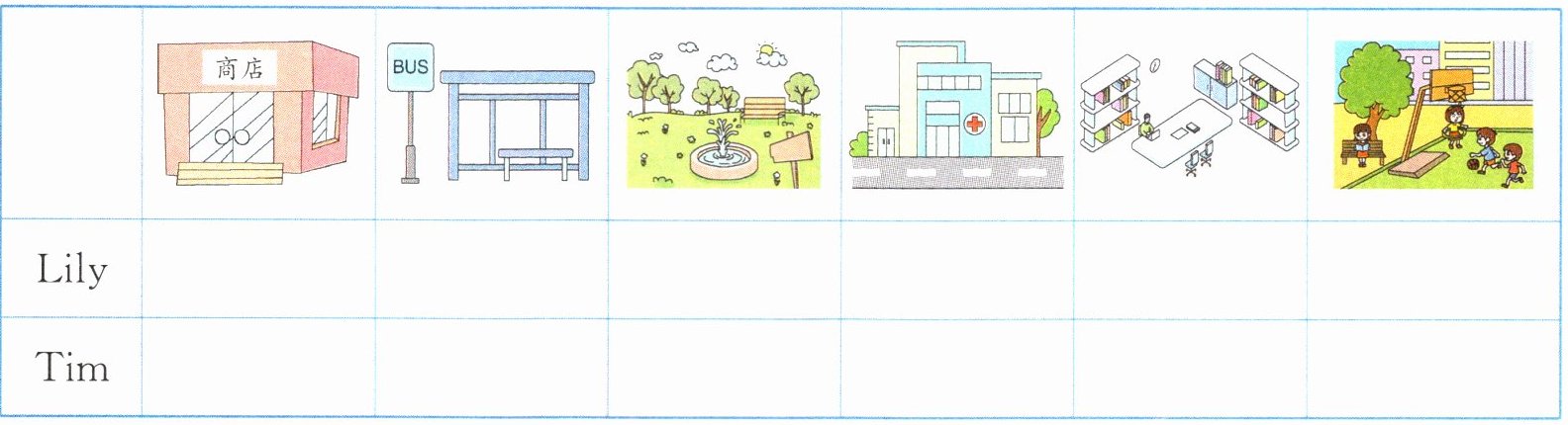 | I'm Lily. There is a big park in my community. We always take a walk there. There is also a library and a bus stop. My favourite place is the library. I often read books there. | My name is Tim. There is a hospital in my community. There are also two playgrounds. My sisters always do sports there. My favourite place is the shop. I can buy many things there. |