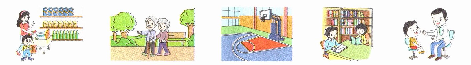 There is a 1.______ in my community. My brother likes to play basketball there. There is a park over there. My parents often 2.______ there. There are some bus stops and 3.______ too. There is also a hospital. People can 4.______ there. My favourite place is the 5.______. I can buy many things in it.