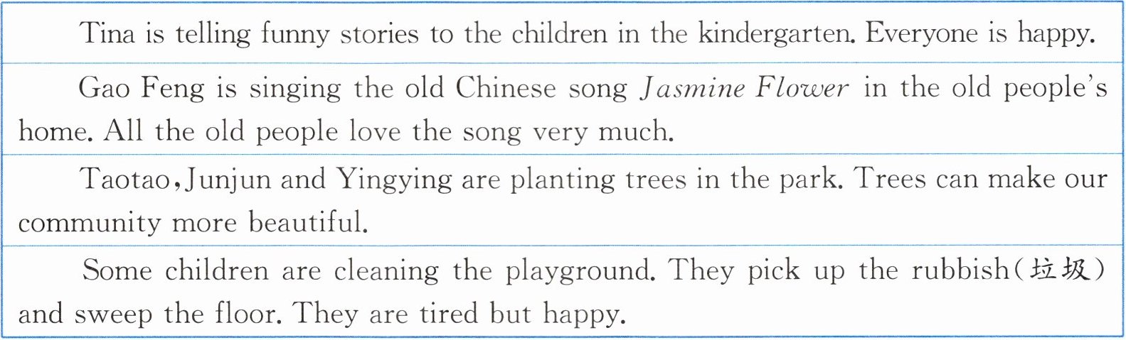 | Some children are cleaning the playground. They pick up the rubbish(垃圾) and sweep the floor. They are tired but happy. |