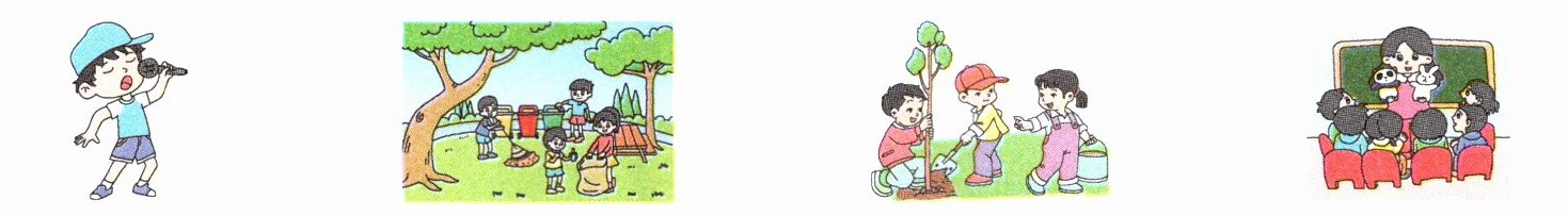 | Taotao, Junjun and Yingying are planting trees in the park. Trees can make our community more beautiful. |