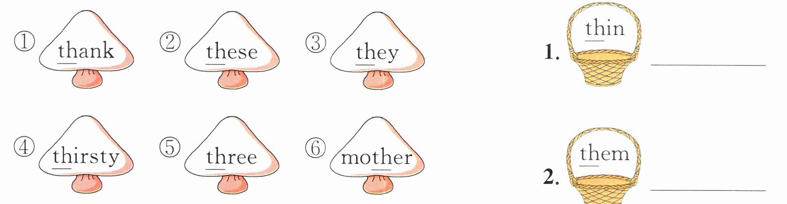 一 小兔子采蘑菇。请你根据画线部分的发音,帮助小兔子把蘑菇放到对应的篮子里。
