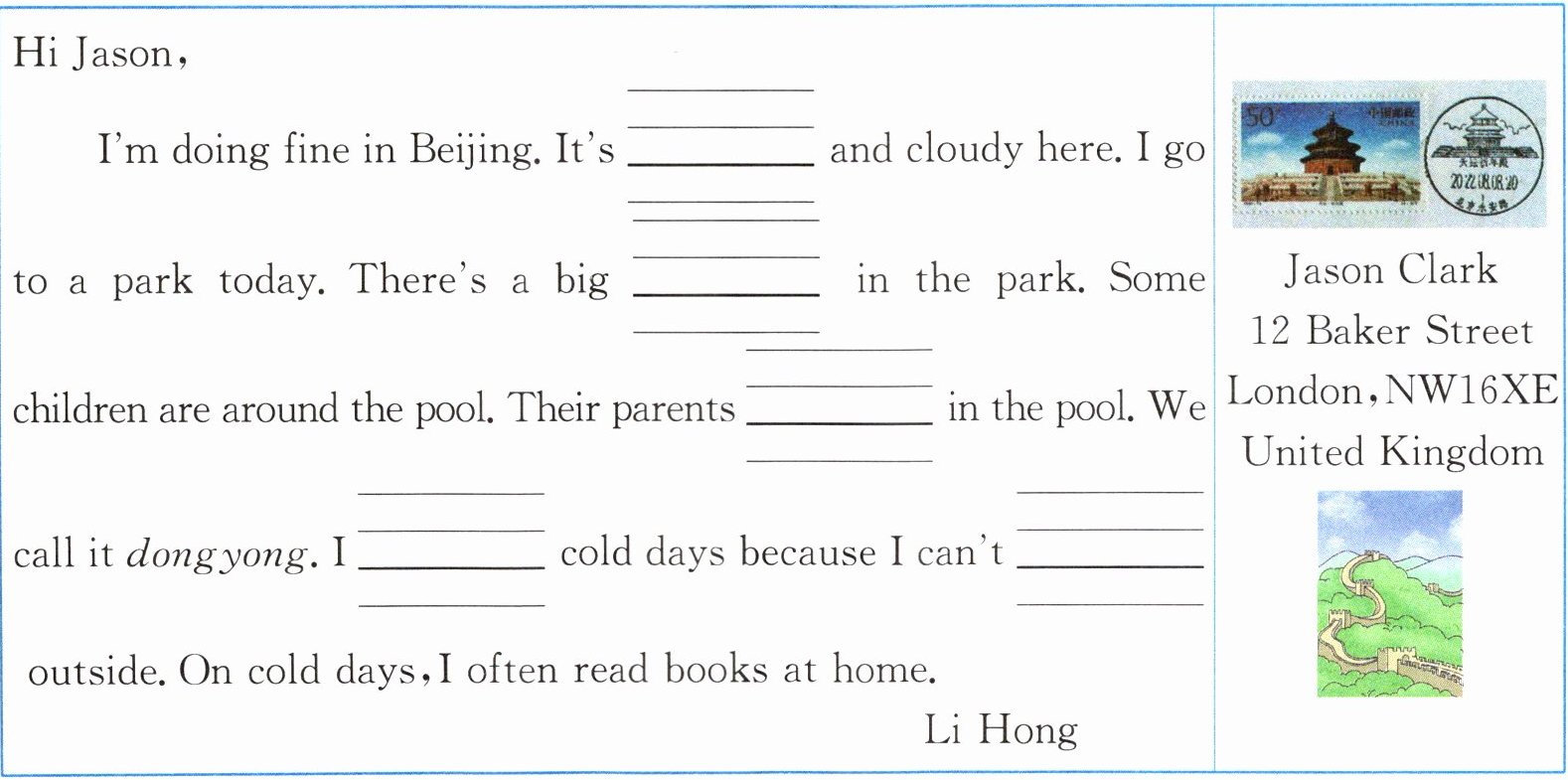 I'm doing fine in Beijing. It's ______ and cloudy here. I go to a park today. There's a big ______ in the park. Some children are around the pool. Their parents ______ in the pool. We call it dongyong. I ______ cold days because I can't ______ outside. On cold days, I often read books at home.