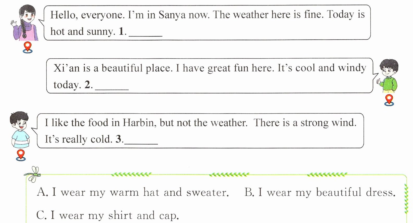 I like the food in Harbin, but not the weather. There is a strong wind. It's really cold. 3.______