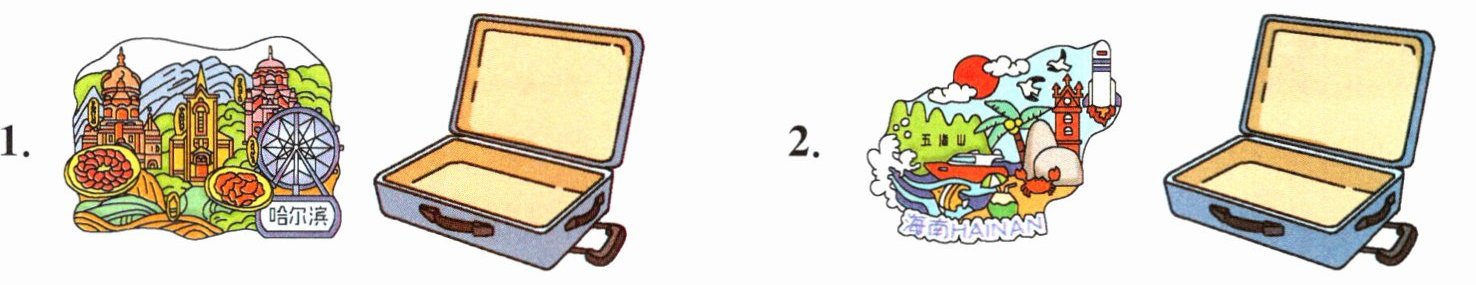 一 Mr Li 让同学们根据自己喜欢的季节来选择地点制定寒假旅行计划,并准备好出行的衣物。认真观察图片,选择合适的衣物放入对应的行李箱内。(填序号)