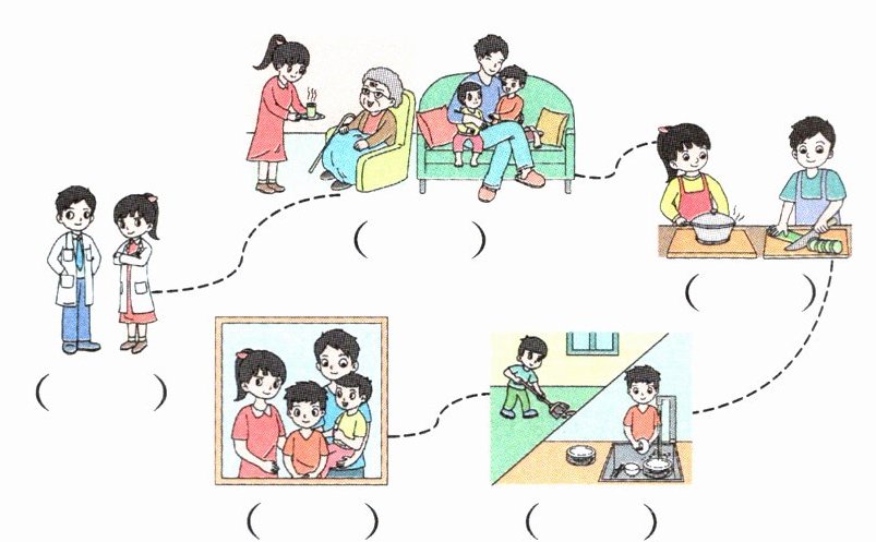 二 Tim 做了一份"幸福家庭"的手抄报。看图,选择与图片相符的句子。