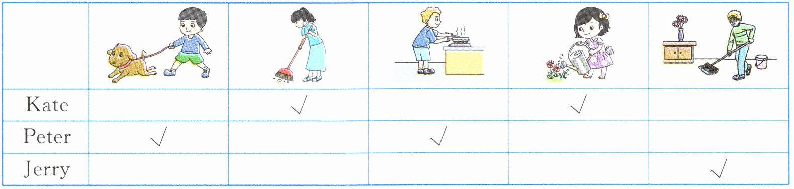 The children are helpful at home. Kate can 1. ______ the floor and 2. ______ the flowers. Peter can 3. ______ the dog and 4. ______. What can Jerry do? He can 5. ______ the room.