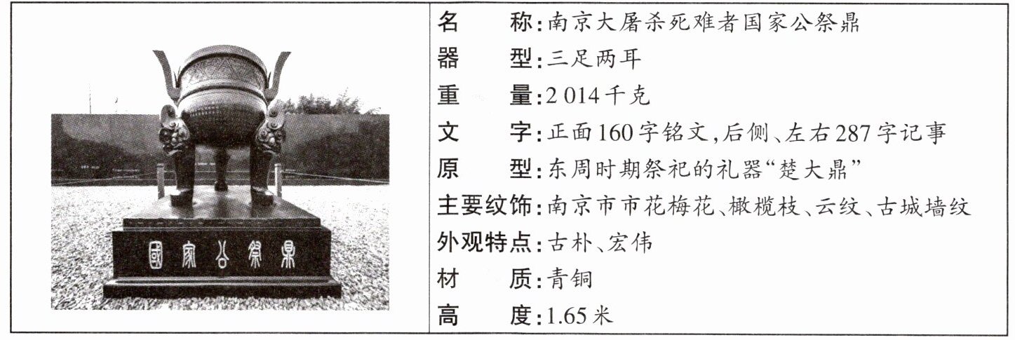 4. 下图是国家公祭鼎,有人为这尊鼎做了一张“名片”,“名片”正面是公祭鼎照片,背面是相关信息。请你根据这些信息,按照合理的顺序,为这尊公祭鼎写一段介绍性文字。(60字左右)(5分)