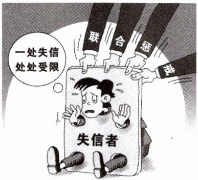 画面内容:画面中有一个被关在类似笼子里的“失信者”,他表情惊恐,笼子上方伸出多只手,分别写着“联合”“惩”“戒”等字,旁边配有文字“一处失信 处处受限”。