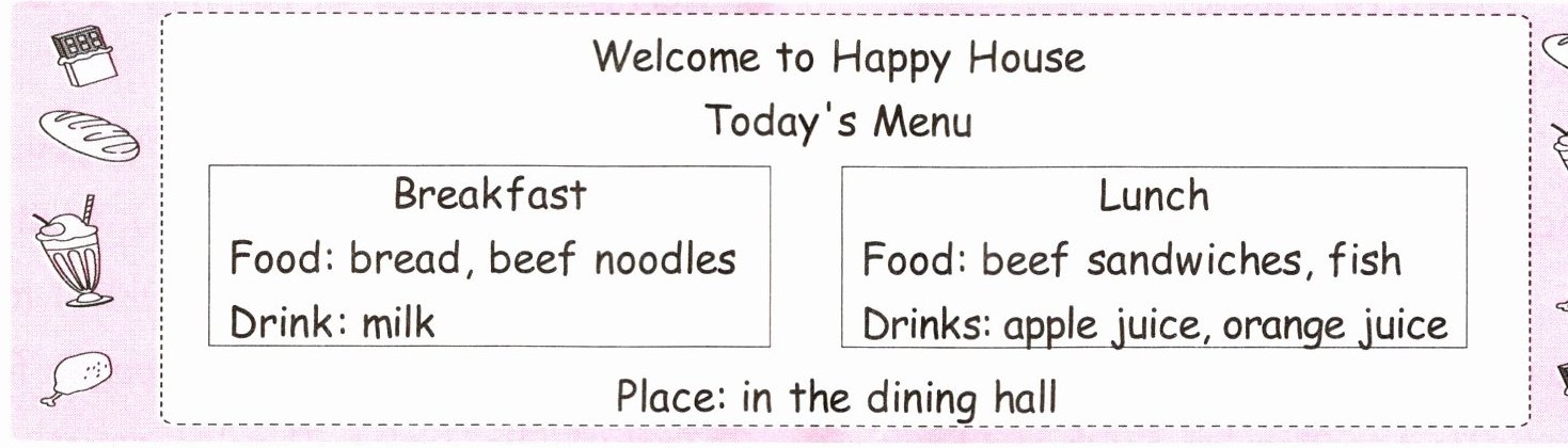 1. C 解析 根据 Breakfast 下方 Food:bread, beef noodles 这一栏的信息可知,早餐可以吃面包和牛肉面。故选 C。 2. A 解析 根据 Breakfast 下方 Drink:milk 这一栏的信息可知,早餐可以喝牛奶。故选 A。 3. B 解析 根据最下方 Place:in the dining hall 这一栏的信息可知,Happy House 在学校的餐厅里。故选 B。 4. C 解析 根据 Lunch 下方 Food:beef sandwiches, fish 这一栏的信息可知,午餐可以吃牛肉三明治和鱼肉。故选 C。