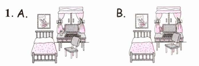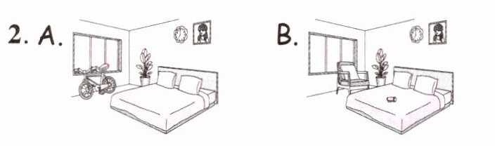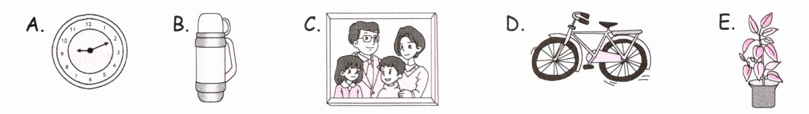 1. bike; D 2. plant; E 3. water bottle; B 4. clock; A 5. photo; C