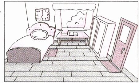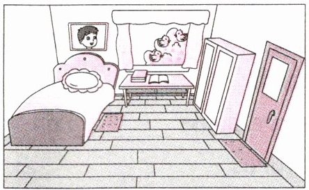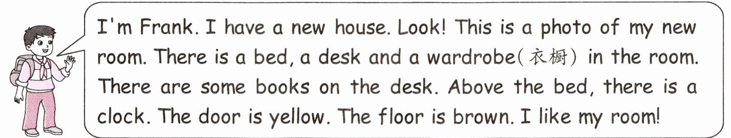 I'm Frank. I have a new house. Look! This is a photo of my new room. There is a bed, a desk and a wardrobe(衣橱) in the room. There are some books on the desk. Above the bed, there is a clock. The door is yellow. The floor is brown. I like my room!