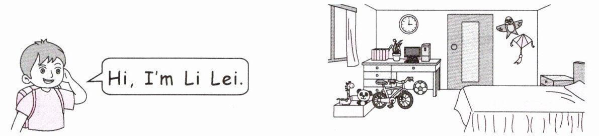 Hi, I'm Li Lei. This is my room. There is a big bed and a big desk in the room. Above the desk, there is a clock. There is a computer, a plant and some books on the desk. The plant is between the books and the computer. And there is a football under the desk. In front of the desk, there is a bike and a box. There are some toys in the box. There are two kites on the wall, too.