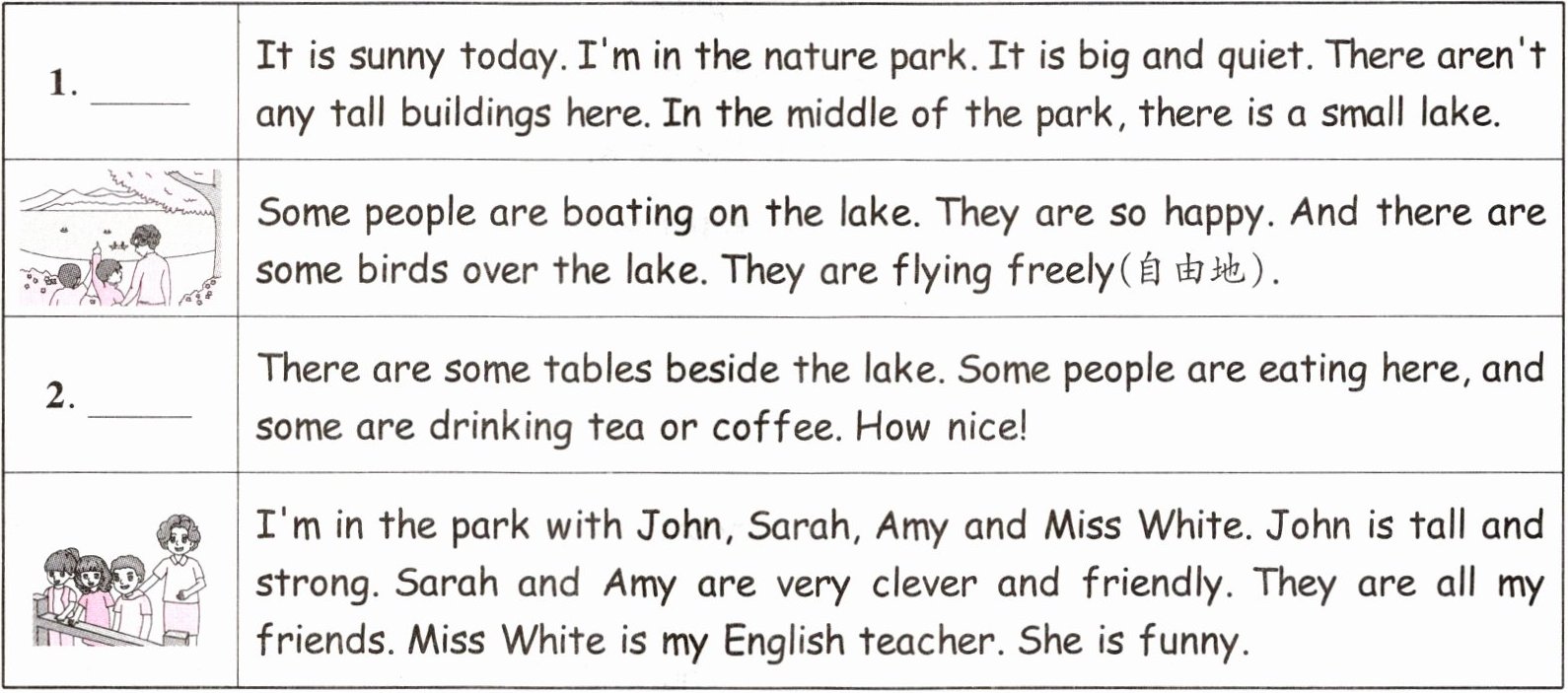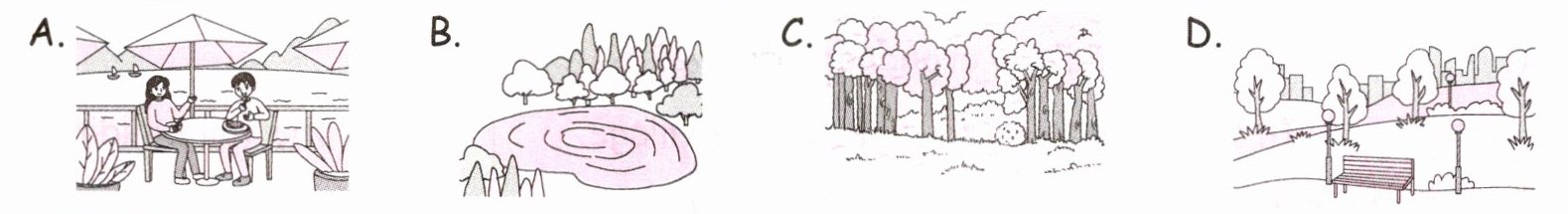 | 2. ______ | There are some tables beside the lake. Some people are eating here, and some are drinking tea or coffee. How nice! |