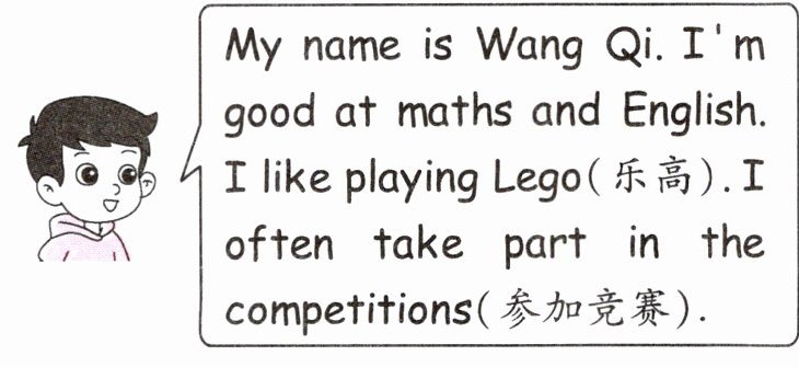 "My name is Wang Qi. I'm good at maths and English. I like playing Lego(乐高). I often take part in the competitions(参加竞赛)."