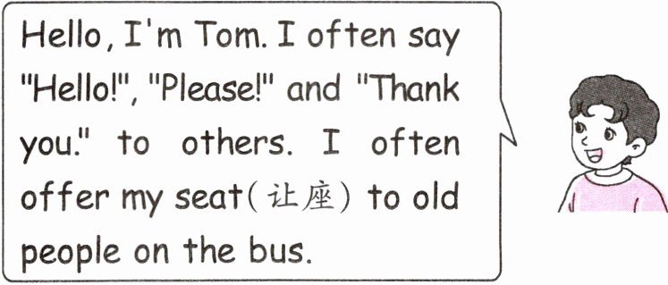 "Hello, I'm Tom. I often say "Hello!", "Please!" and "Thank you." to others. I often offer my seat(让座) to old people on the bus."
