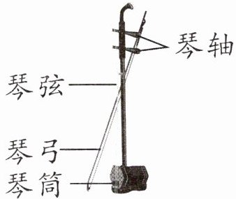 二胡是一种拉弦乐器,已有一千多年的历史。如右图,它主要由琴弦(两根)、琴轴、琴弓、琴筒等部分构成。琴筒是二胡的重要部分,是通过弓的推拉运动,擦弦后振动琴皮发音的共鸣体。琴轴共有上下两个(又名琴轸),起调整音高的作用,上轴缚绞内弦,下轴缚绞外弦。琴弦是琴的发音体之一,也是二胡的声源体之一。