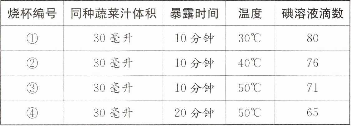 | 烧杯编号 | 同种蔬菜汁体积 | 暴露时间 | 温度 | 碘溶液滴数 |