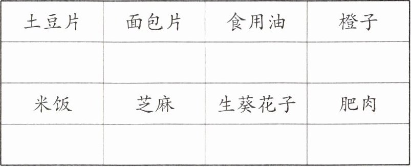 2. 在含有淀粉的食物下画“△”,在含有脂肪的食物下画“○”,其他的画“□”。