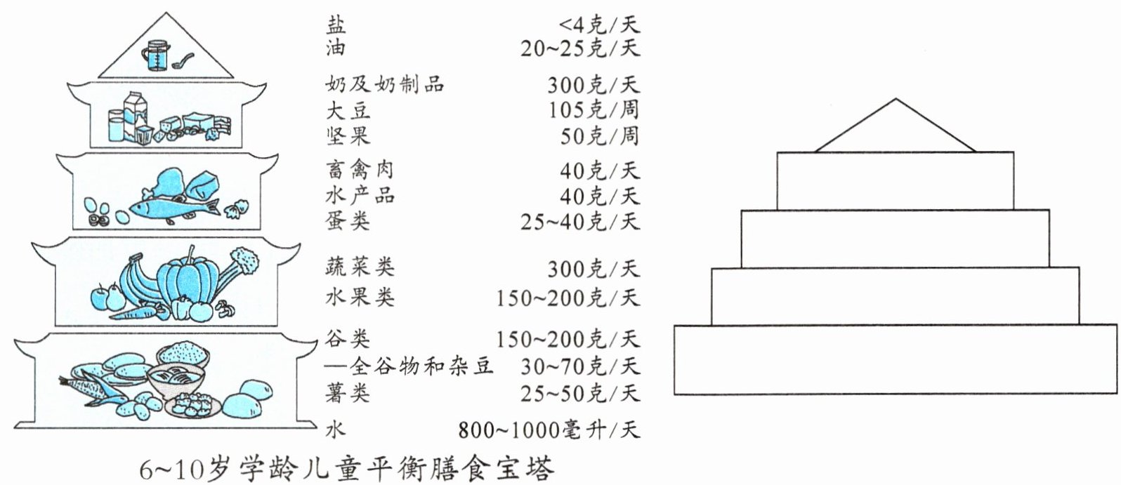 1.“平衡膳食宝塔”中的食物含有人体所需的蛋白质、糖类、______、维生素、______和水等营养。将小科制订的菜单中的食物填写在上图右边“平衡膳食宝塔”的相应层级中。