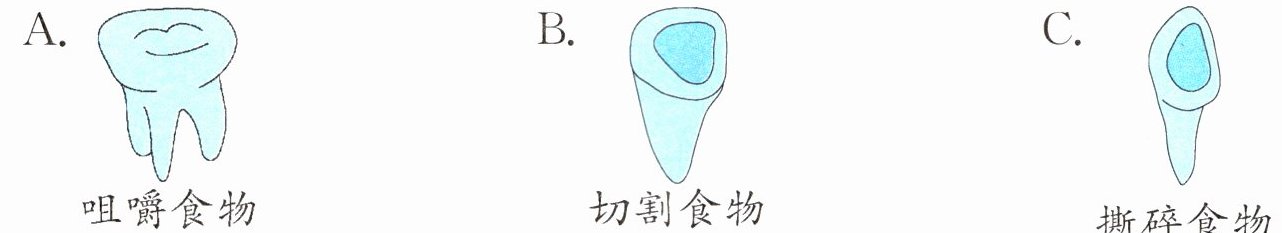3. 回家后,小科和妈妈一起看检查单,妈妈说:“小宝宝吃的食物比较软,但是长大后,吃的食物种类变丰富了,对牙齿咀嚼功能的要求也就更高了,所以妈妈现在有20颗臼齿。”从妈妈的话中,我们可以推测臼齿的形状和功能是( )。