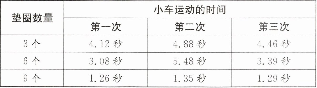 某科学实验小组用细线、小车、垫圈等材料组装了一个小缆车(如右图所示),在光滑的桌面上做“小车运动快慢与拉力大小的关系”实验,下表中是他们记录的数据。(挂2个垫圈,刚好能使小缆车运动起来。)