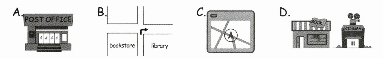 1. A, post office 2. D, cinema 3. B, Turn right 4. C, BDS
