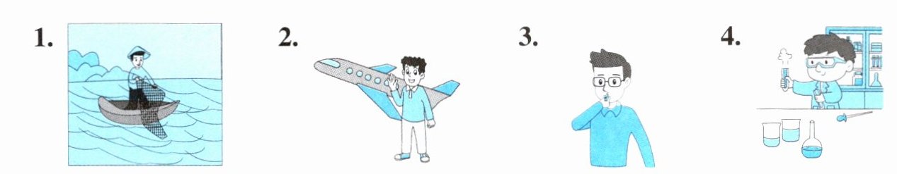 1. fisherman; sea 2. pilot; plane 3. coach, gym 4. scientist, university