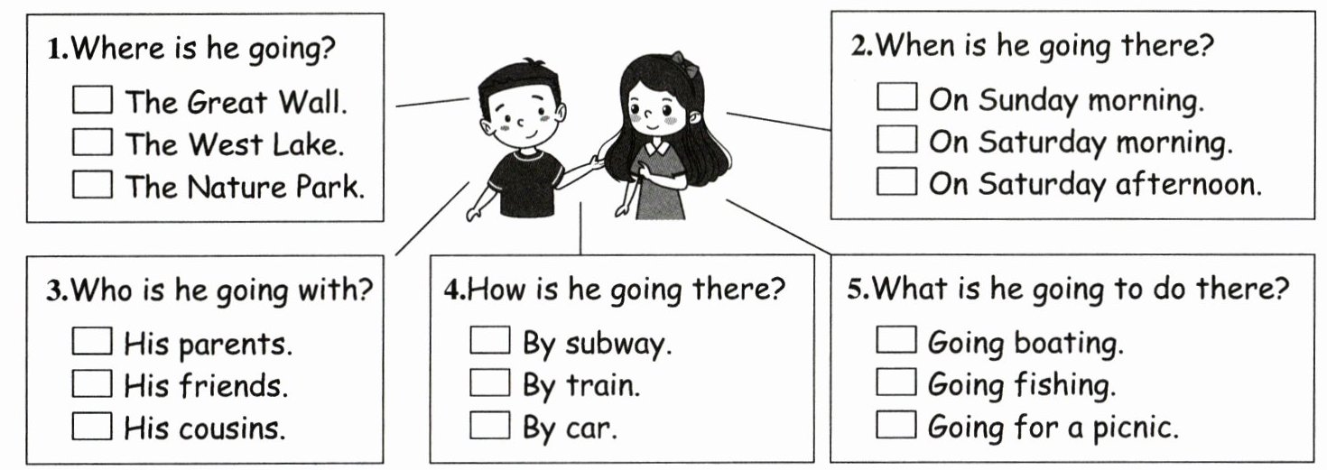 | □ His parents. □ His friends. □ His cousins. | □ By subway. □ By train. □ By car. | □ Going boating. □ Going fishing. □ Going for a picnic. |