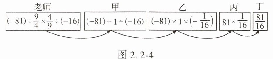 1. 老师设计了一个接力游戏,给出一个算式,学生用小组合作的方式完成运算,规则是:每人只能看见前一人给的式子,并进一步计算,再传递给下一人完成一步计算,以此类推,最后得出结果. 过程如图 2.2 - 4 所示,自己负责的一步计算错误的是(