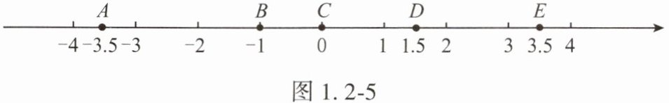 7. 如图 1.2-5,写出数轴上点 A,B,C,D,E 所表示的数,并写出点 B,E 之间的距离.