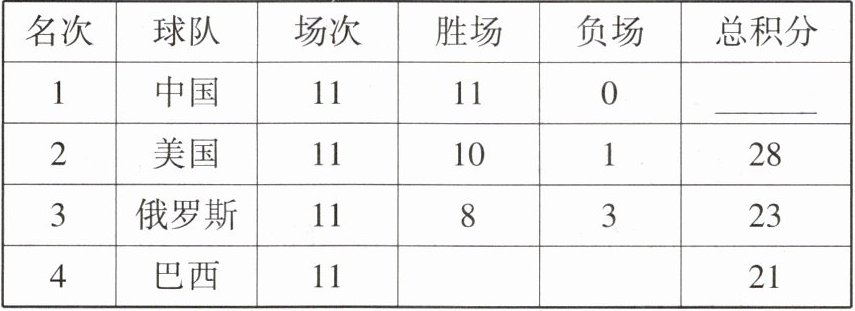 2. 2019年9月29日,中国女排以十一连胜的战绩夺得女排世界杯冠军,成为世界三大赛的“十冠王”. 2019年女排世界杯的参赛队伍为12支,比赛采取单循环方式,五局三胜,积分规则如下:比赛中以3:0或者3:1取胜的球队积3分,负队积0分;而在比赛中以3:2取胜的球队积2分,负队积1分. 前四名队伍积分榜部分信息如表5.3 - 2.