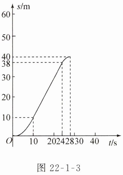 17. (选做题)一辆电动车在行驶过程中,前 $ 10s $ 行驶的路程 $ s(m) $ 与时间 $ t(s) $ 满足关系式 $ s = at^{2} $,第 $ 10s $ 末开始匀速行驶,第 $ 24s $ 末开始刹车,第 $ 28s $ 末停止行驶,此时离终点 $ 20m $ 远,图 22 - 1 - 3 是电动车行驶过程记录的图象。