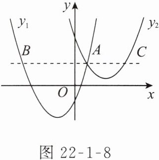 5. 如图$22 - 1 - 8$,抛物线$y_{1}= a(x + 2)^{2}-3与y_{2}= \frac{1}{2}(x - 3)^{2}+1交于点A(1,3)$,过点$A作x$轴的平行线,分别交两条抛物线于点$B$,$C$,给出以下结论:①无论$x$取何值,$y_{2}$的值总是正数;②$a = 1$;③当$x = 0$时,$y_{2}-y_{1}= 4$;④$2AB = 3AC$。其中正确的有(
