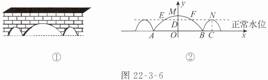 14. 如图 22-3-6①,三孔桥截面的三个孔都呈抛物线形,两个小孔形状、大小都相同. 如图 22-3-6②,正常水位时,大孔水面宽度 $ AB = 20 $ m,顶点 $ M $ 距水面 6 m(即 $ MO = 6 $ m),小孔顶点 $ N $ 距水面 4.5 m(即 $ NC = 4.5 $ m). 当水位上涨刚好淹没小孔时,求此时大孔的水面宽度 $ EF $.