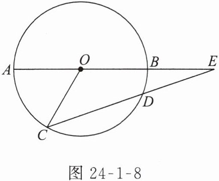15. 如图 24-1-8,$AB是\odot O$的直径,$CD是\odot O$的弦,$AB$,$CD的延长线交于点E$.若$AB = 2DE$,$\angle E = 18^{\circ}$,求$\angle C及\angle AOC$的度数.