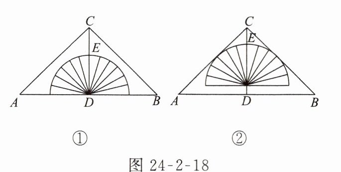 11. 如图 24 - 2 - 18①,将一个量角器与一张等腰直角三角形(△ABC)纸片放置成轴对称图形,$\angle ACB = 90^{\circ}$,$CD\perp AB$,垂足为点 D,半圆(量角器)的圆心与点 D 重合,测得 CE = 5 cm。将量角器沿 DC 方向平移 2 cm,半圆(量角器)恰与△ABC 的边 AC,BC 相切,如图 24 - 2 - 18②,则 AB 的长约为