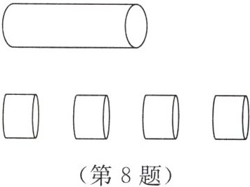 8. 【数学应用】如图,一个体积是$100dm^3$的圆柱形木料,将它平均截成四段,这些木料的表面积比原来增加了$30dm^2,$则所截得的每段圆柱形木料的长为多少?