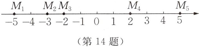 14. 【数学应用】如图,在一条笔直的马路上,依次有5个卡通人,它们站立的位置在数轴上依次用点$M_1$,$M_2$,$M_3$,$M_4$,$M_5$表示。