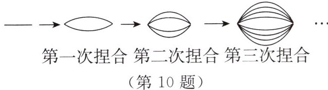 10. 【数学应用】拉面馆的师傅用一根很粗的面条,把两头捏合在一起拉伸,再捏合,再拉伸,反复几次,就把这根很粗的面条拉成许多根细的面条。如图所示,一根较粗的面条先对折成2根再拉开,然后将两端捏紧,再对折成4根再拉开……一直重复这个流程,面条的数量会不断增多,也会不断变细。将这个流程重复7次后,面条的数量会变成(