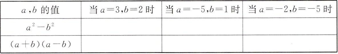 13. 【综合与实践】(1)当 $ a $,$ b $ 取不同数值时,计算 $ a^{2} - b^{2} $ 及 $ (a + b)(a - b) $ 的值,并将计算结果填入下表: