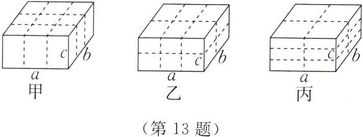 13. 【数学应用】有一个长方体形状的物体,它的长、宽、高分别为 $ a $,$ b $,$ c $($ a > b > c $)。现有三种不同的捆扎方式(如图所示的虚线),哪种方式用绳最少?哪种方式用绳最多?请说明理由。(不计接头处)