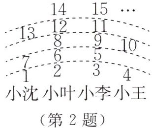 2. 四个小朋友站成一排,老师按图中的规则数数,数到 107 时对应的小朋友可得一朵红花,那么得红花的小朋友是( )。